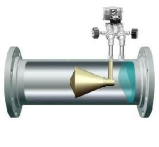 錐形流量計是在管道中芯處懸掛一錐形節(jié)流件,錐形件阻礙介質(zhì)的流動,重塑流速曲線,在錐形性的下游可立即形成低壓區(qū),管道上游的正壓同經(jīng)節(jié)流件節(jié)流后的下游的負(fù)壓之間有一差壓,將正、負(fù)壓用取壓口取出,正壓口位于管道的上游,負(fù)壓口位于錐體的末端,通過測量兩者之間差壓,根據(jù)伯努力方程即可計算出管道中的流量,錐體位于管線中芯,可對所測介質(zhì)的流速曲線進(jìn)行優(yōu)化,因此測量精度高,對儀表上、下游的直管段要求低。